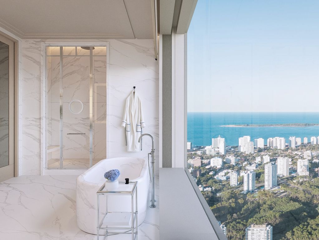 Concibidos por el renombrado arquitecto de interiores Hassen Balut, los sofisticados interiores están diseñados para realzar las vistas pintorescas de Punta del Este y más allá. Con cocinas personalizadas diseñadas específicamente para Cipriani y pisos de mármol importados de Italia, cada residencia ofrece amplias vistas al océano de Playa Brava o Playa Mansa y techos altos de 3.4 metros, con ter